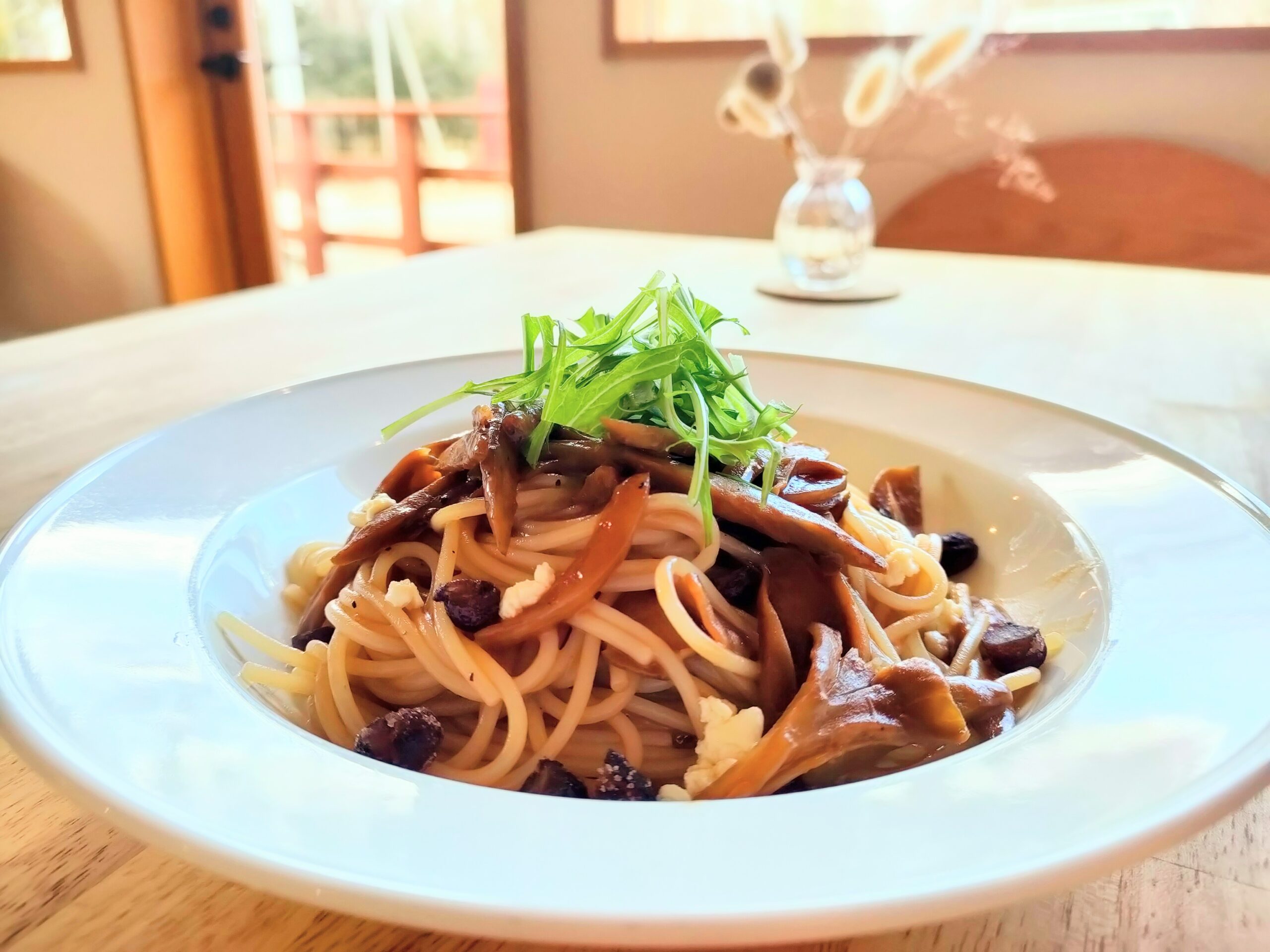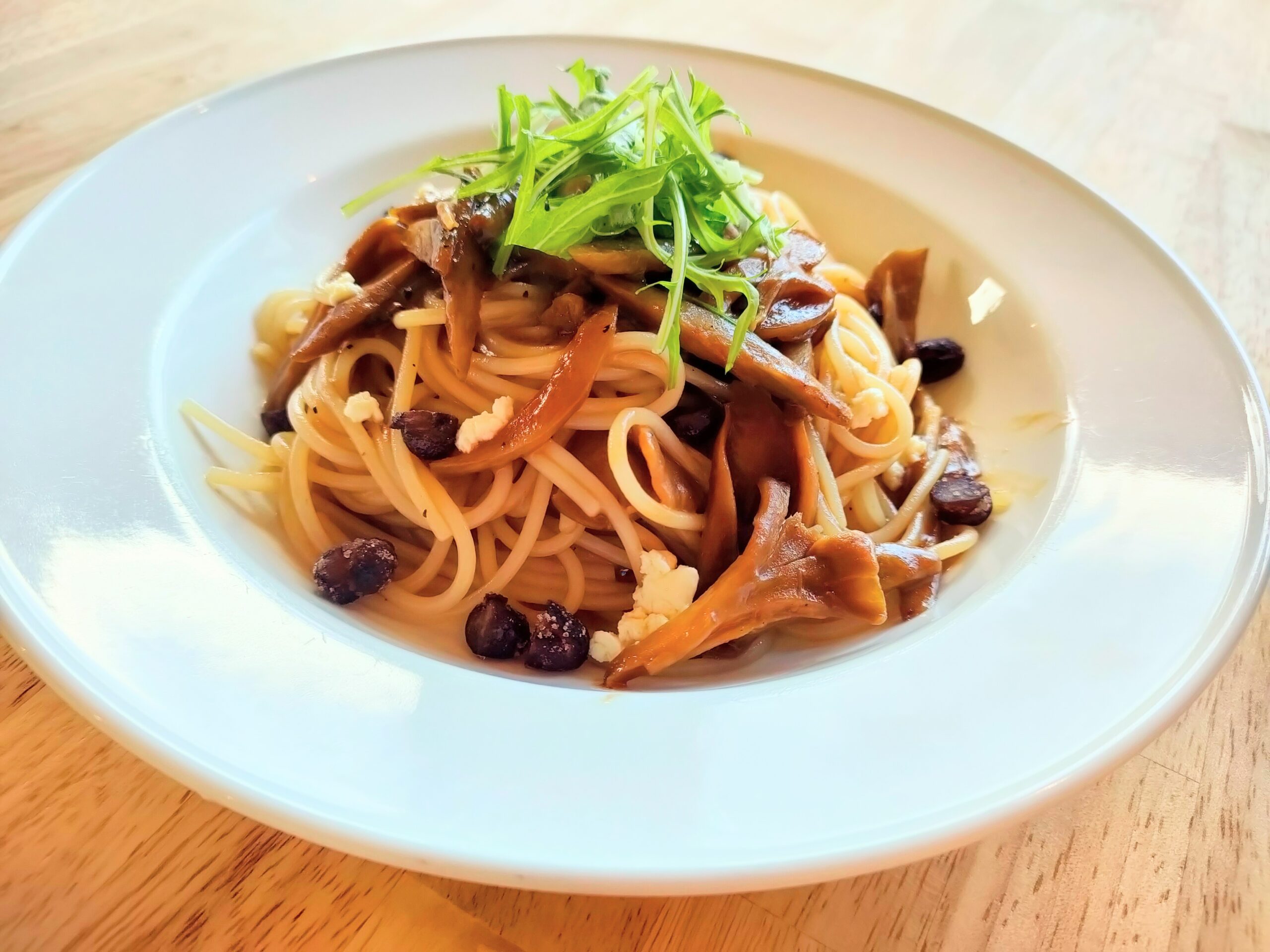 ・ごぼうとまいたけの八丁味噌味のパスタ